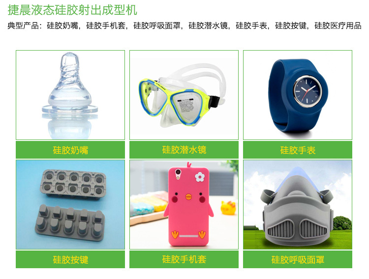 捷晨固体硅胶制品挤出注塑热压成型机 经典故事终产物:矽胶奶嘴,矽胶小米5手机套,矽胶享受头罩,矽胶潜水镜,矽胶手表,矽胶组合键,矽胶医辽产品